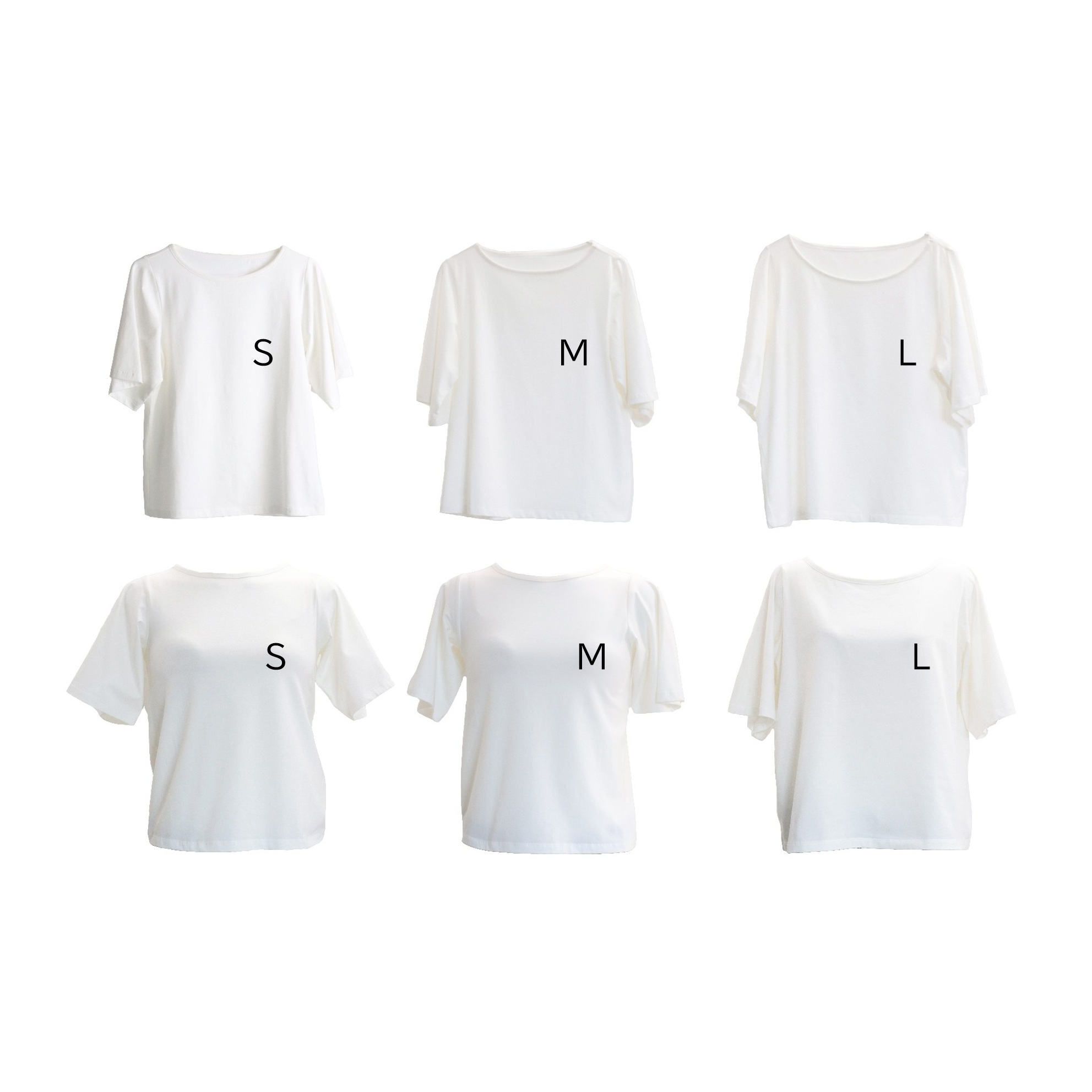 | M | 普段MサイズやSサイズを着られている女性のために作られた型。ボートネックのため、首回りの抜け感を出しつつも、肌の露出がおさえられます。袖の位置を肩幅より少し内側に入れることにより、女性らしいシルエットを演出できます。丈は短めのため、スカート、パンツ、両方にあわせられます。 |