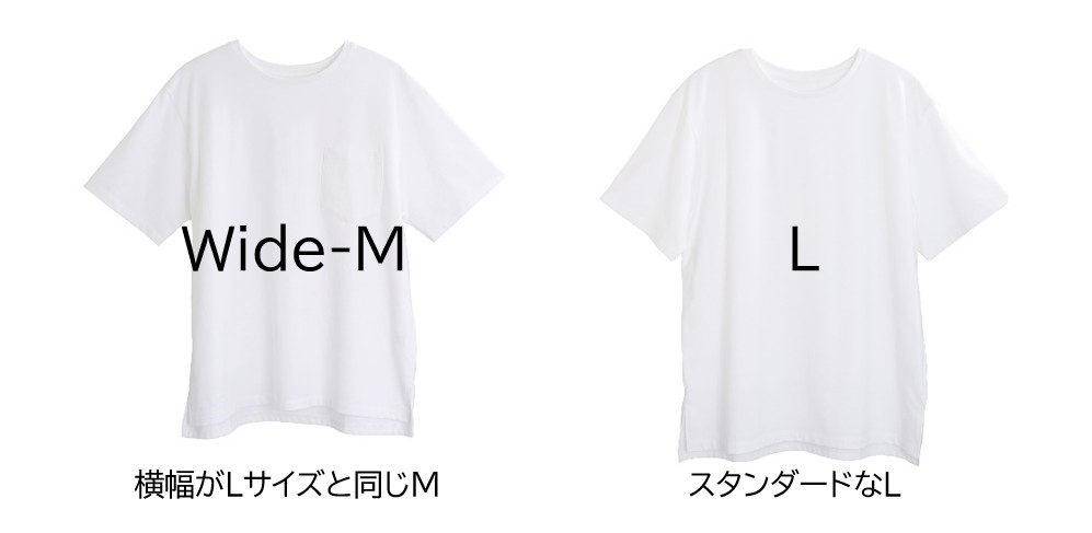 - ワイド-M:身幅や袖の太さはLサイズと同じでゆったりめの作り、身丈は通常のMで、袖は通常のMより長めです
