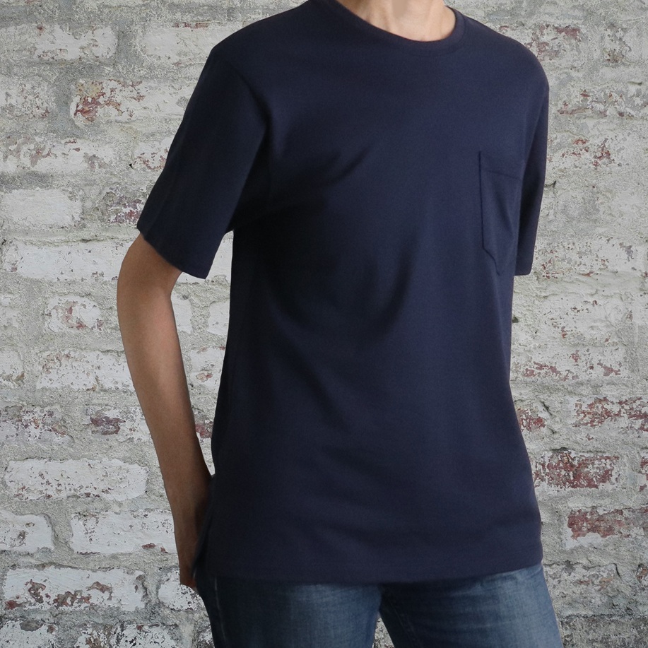 胸元のポケットがさりげないアクセントとなるポケットつきネイビー無地Tシャツ。