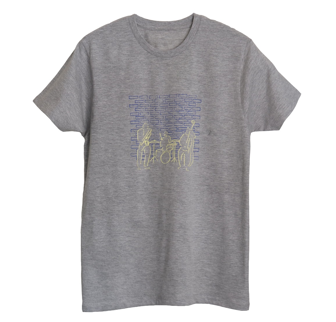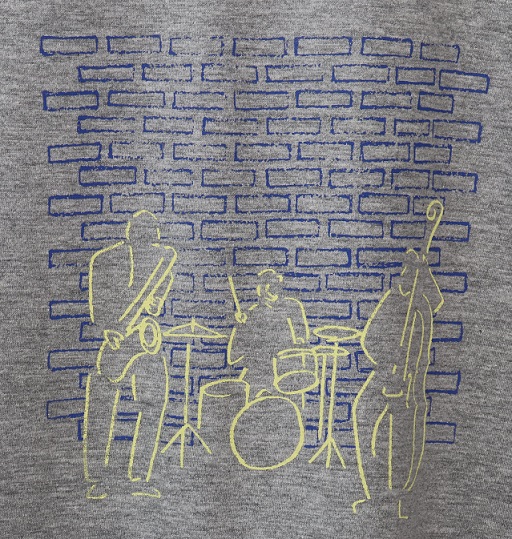 A jazz band featuring trumpet, bass, and drums. The print shows stylized outlines of the musicians performing against a brick wall backdrop.